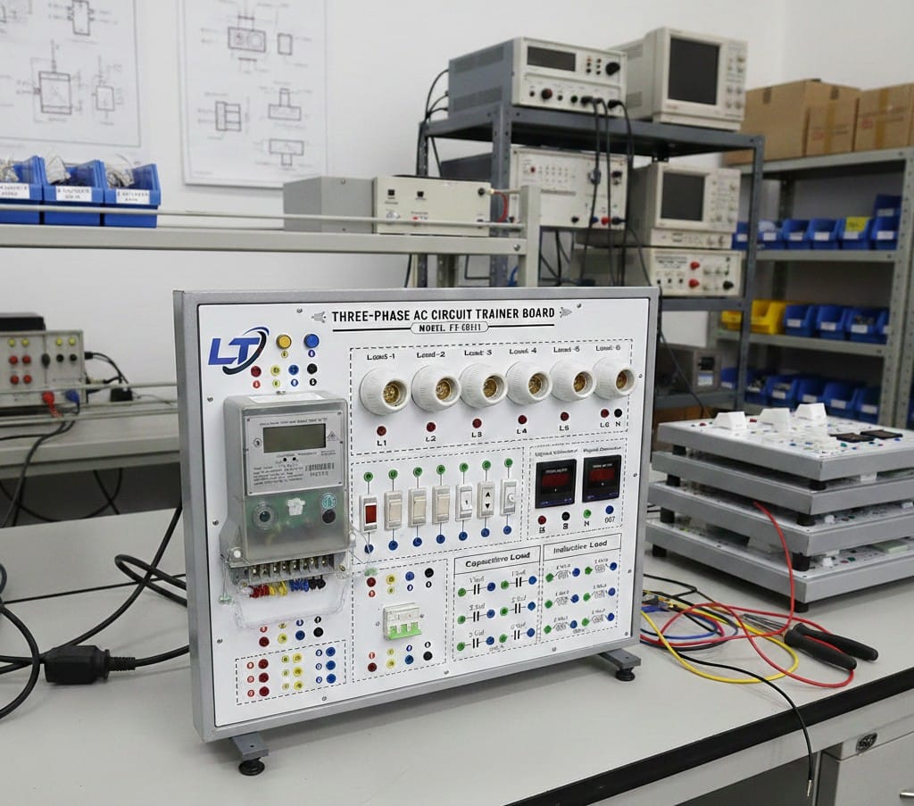 Connections Uses standard 4mm shrouded safety banana sockets for all input output and interconnection points to ensure user safety during e peri mints Protection Includes standard safety devices such as Main MCB Miniature Circuit Breaker Emergency STOP push button Appropriate fuses or thermal cutouts Measurement Integrated digital or analog meters Voltmeters Ammeters for measuring essential parameters ”